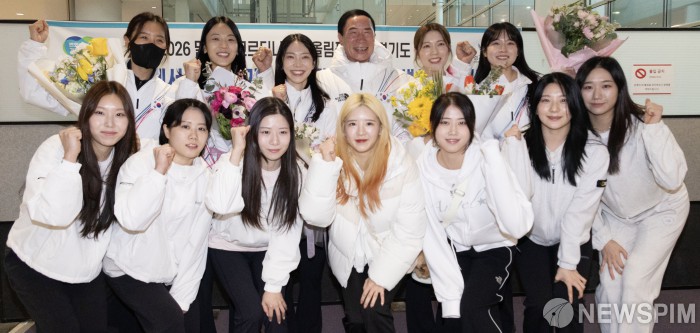 [영종도=뉴스핌] 류기찬 기자 = 2026 밀라노·코르티나담페초 동계 올림픽에 참가한 여자 컬링 국가대표팀(뒷줄)이 24일 오후 인천국제공항 제2여객터미널 도착해 경기도청 관계자들과 기념촬영을 하고 있다. 2026.02.24 ryuchan0925@newspim.com