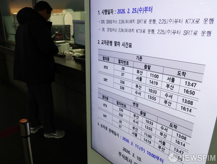 [서울=뉴스핌] 김현우 기자 = 수서발KTX-서울역SRT 시범 교차운행 시작된 25일 오후 서울 강남구 수서역 전광판에 시범 교차운행 안내문이 나오고 있다. KTX는 수서역∼부산역을, SRT는 서울역∼부산역을 매일 각 1회 왕복 운행한다. 2026.02.25 khwphoto@newspim.com