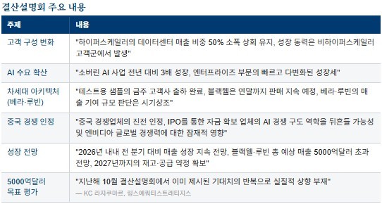 뒤이은 결산설명회에서 엔비디아는 이번 분기를 "또 한 번의 탁월한 분기"라고 평가하면서 고객 다변화·추론 시장 입지·향후 성장 전망 등을 중점적으로 다뤘다. 다만 블랙웰·루빈 총 예상 매출 5000억여달러에 대한 추가적인 상향은 제시되지 않아 실망감이 따랐다.