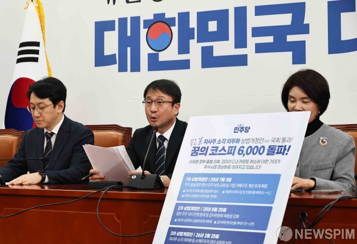 한정애 정책위의장은 "지난해부터 올해까지 세 번에 걸쳐 상법을 개정하면서 자본시장 선진화를 위해 최선을 다해왔다"며 "그 성과는 코스피 6000이라는 숫자로 명확하게 증명된다. 우연이 아니다"라고 밝혔다.