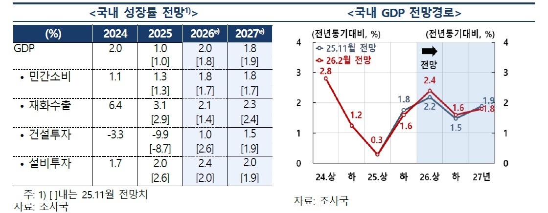 한국은행이 26일 발표한 경제전망에 따르면 올해 실질 국내총생산(GDP) 성장률 전망치는 2.0%로 지난해 11월 전망(1.8%)보다 0.2%포인트 상향 조정했다. 내년(2027년) 성장률은 1.8%로 제시했다.