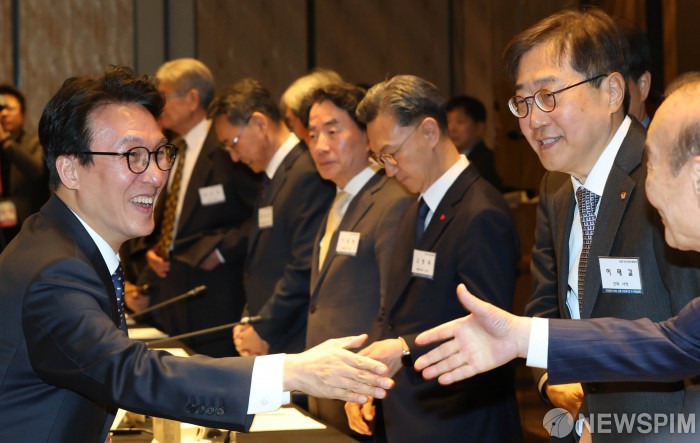 [서울=뉴스핌] 류기찬 기자 = 김민석 국무총리가 26일 오후 서울 종로구 포시즌스 호텔 서울에서 열린 ‘한국경영자총협회 오찬 및 K-국정설명회’에서 참석자들과 인사를 나누고 있다. 2026.02.26 ryuchan0925@newspim.com