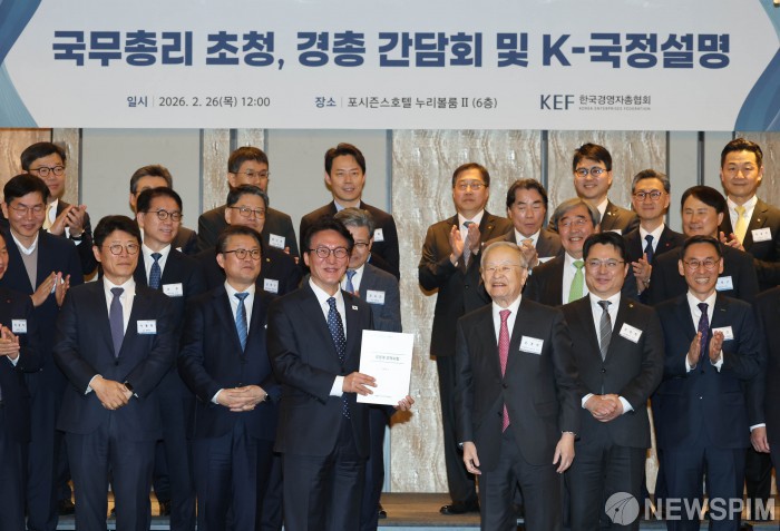[서울=뉴스핌] 류기찬 기자 = 김민석 국무총리가 26일 오후 서울 종로구 포시즌스 호텔 서울에서 열린 ‘한국경영자총협회 오찬 간담회 및 K-국정설명회’에서 손경식 경총 회장에게 건의사항을 전달받은 뒤 기념촬영을 하고 있다. 2026.02.26 ryuchan0925@newspim.com