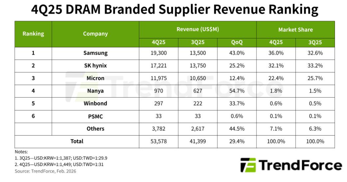 삼성전자의 지난해 4분기 D램 매출은 193억 달러로 전 분기보다 43% 늘었으며 점유율은 3.4%p(포인트) 상승한 36%를 달성했다. 평균판매단가(ASP) 상승률은 약 40%로 상위 3사 중 가장 높았다. 반면 SK하이닉스는 매출이 25.2% 증가한 172억2000만 달러(약 24조5000억 원)를 기록했으나, 점유율은 1.1%p 하락한 32.1%로 2위로 밀려났다. 미국 마이크론은 매출 119억8000만 달러(약 17조 원), 점유율 22.4%로 3위에 머물렀다. 마이크론은 한국 기업들보다 조기에 계약 협상을 진행한 영향으로 ASP 상승률이 17%에 그쳤다.