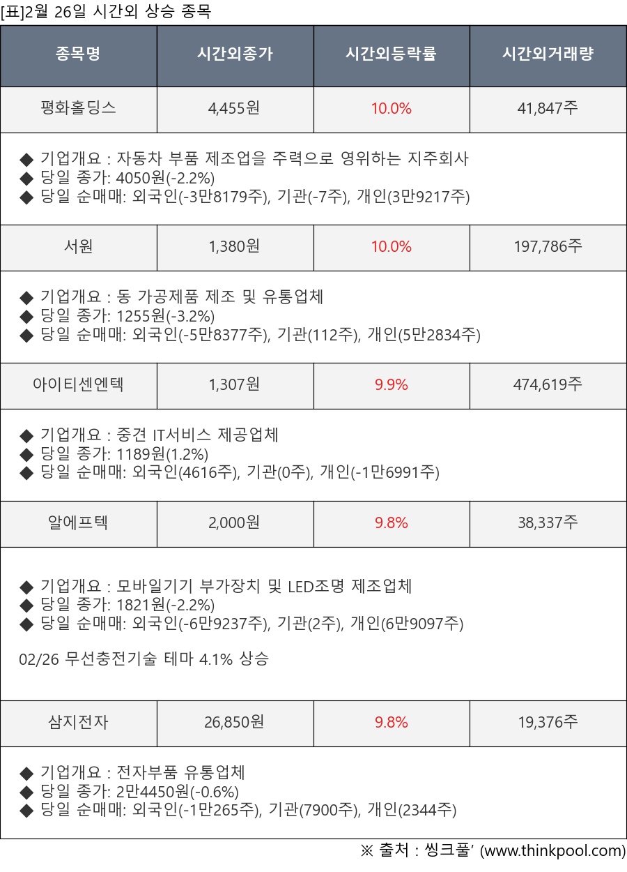 [서울=뉴스핌] 로보뉴스 = 2월 26일, 인공지능 투자비서 ‘AI라씨로’는 시간외 단일가 매매에서 주가가 크게 변동한 평화홀딩스(010770), 서원(021050) 등의 최근 동향을 분석해서 발표했다.