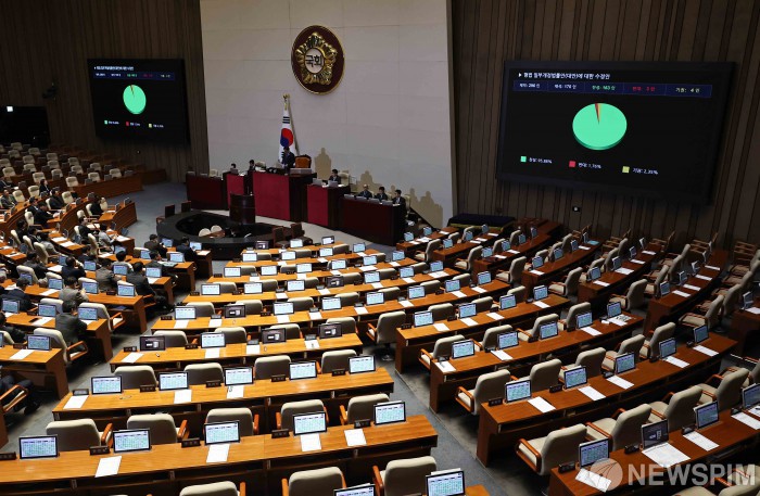 [서울=뉴스핌] 윤창빈 기자 = 26일 오후 서울 여의도 국회에서 열린 본회의에서 형법 일부개정법률안(대안)에 대한 수정안이 통과되고 있다. 2026.02.26 pangbin@newspim.com