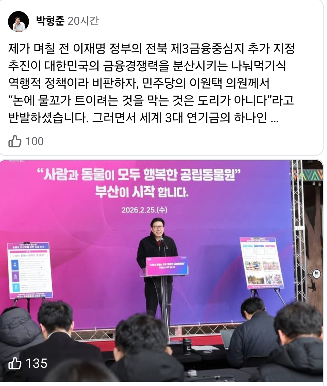 박 시장은 지난 26일 페이스북의 적은 글을 통해 "이재명 정부가 추진 중인 제3금융중심지 지정은 금융 경쟁력을 분산시키는 정치적 결정"이라고 밝혔다.