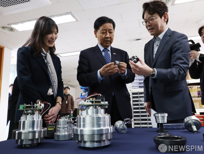 [서울=뉴스핌] 김현우 기자 = 구윤철 부총리 겸 재정경제부 장관이 27일 오전 서울 성수동 뉴로메카에 방문해 혁신조달 AI기업 연구실을 살펴보고 있다 2026.02.27 khwphoto@newspim.com