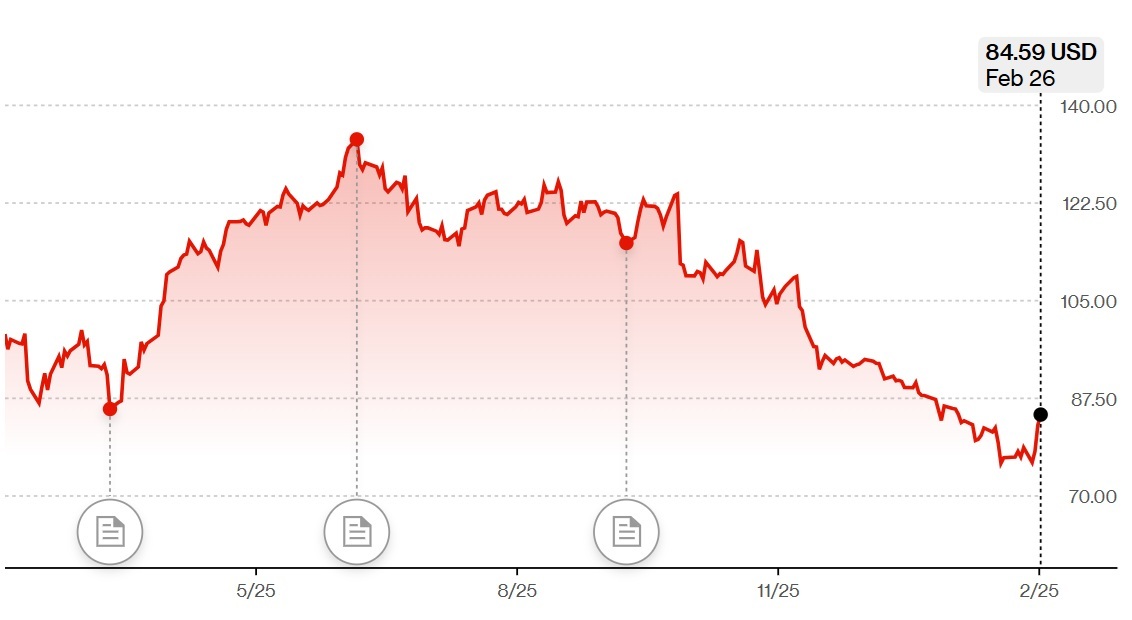 업체의 주가는 지난 20일 76달러까지 하락하며 지난해 6월 기록한 52주 최고치 134.12달러에서 43% 가량 후퇴했다.