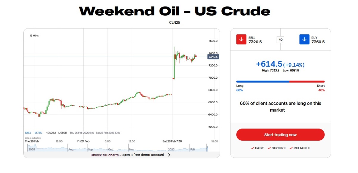 [서울=뉴스핌] 오상용 기자 = 미국과 이스라엘의 이란 공습으로 현지시간 28일 IG그룹에서 운영하는 개인 투자자용 원유선물 상품 거래 플랫폼에서 미국 서부텍스산원유(WTI) 선물 가격이 전일 종가 대비 장중 12% 급등, 배럴당 75.33달러에 달한 것으로 나타났다.