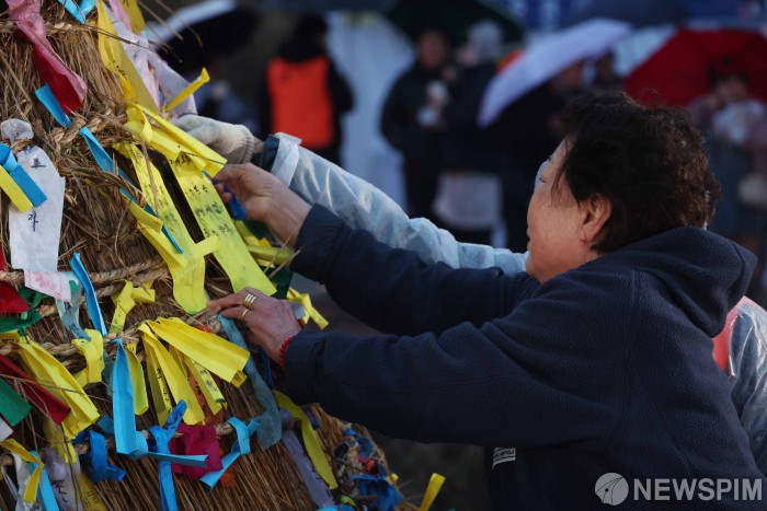 [서울=뉴스핌] 이형석 기자 = 2일 밤 서울 노원구 당현천 일대에서 열린 정월대보름 행사에서 달집에 소원지를 걸고 있다. 2026.03.02 leehs@newspim.com