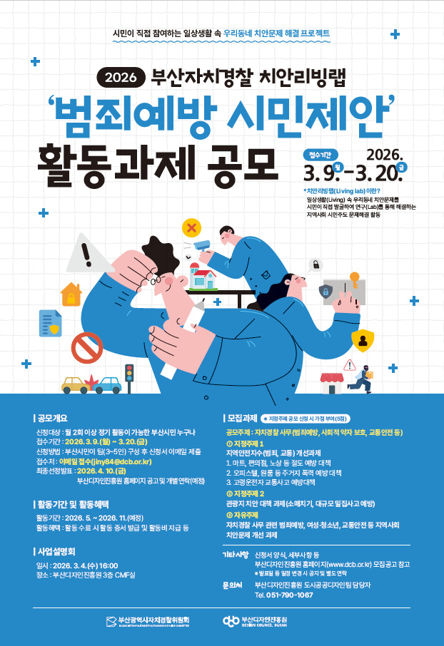 [부산=뉴스핌] 남동현 기자 = 부산시 자치경찰위원회는 부산디자인진흥원과 함께 오는 9일부터 20일까지 2026년 부산자치경찰 치안리빙랩 공모전을 개최한다고 4일 밝혔다.