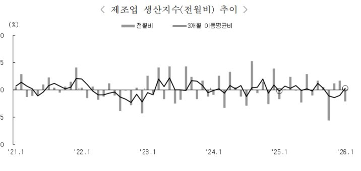 전산업생산은 지난해 10월 2.2% 감소한 이후 같은해 11월(0.7%), 12월(1.0%) 증가했지만, 지난 1월 다시 감소했다. 부문별로는 공공행정에서 1.2%가 늘었지만, 광공업(-1.9%), 건설업(-11.3%) 등에서 감소했다.