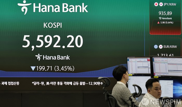 [서울=뉴스핌] 양윤모 기자= 이란 사태 장기화 우려속 4일 오전 코스피가 전장 종가보다 199.71포인트(3.45%) 하락하며 5592.20으로, 코스닥은 63.58포인트(5.59%) 하락한 1074.12로 거래를 시작한 가운데, 서울 중구 하나은행 을지로본점 딜링룸에서 직원들이 업무를 보고 있다. 서울외환시장에서 달러/원 환율은 전장 대비 12.30원 상승한 1478.40원에 주간거래를 시작했다. 2026.03.04 yym58@newspim.com