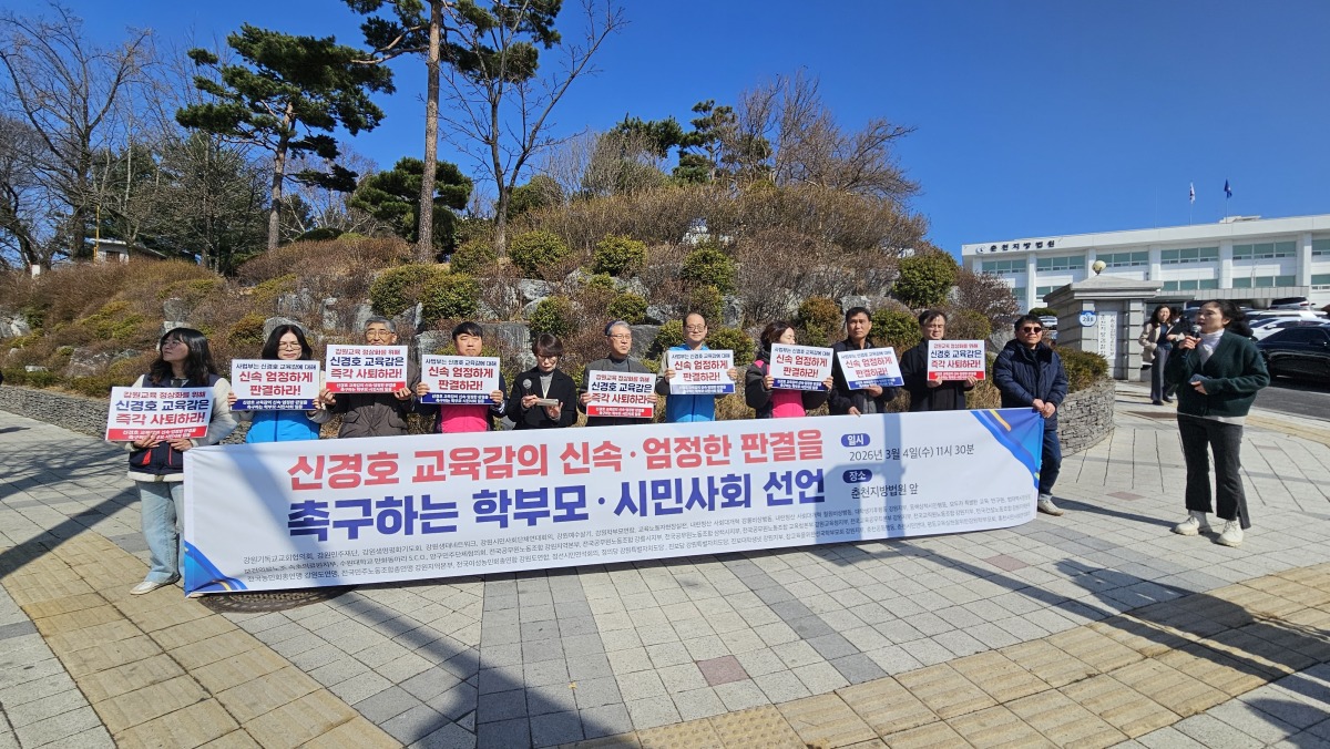 4일 춘천지방법원 앞에서 열린 기자회견에서 39개 단체는 "교육감이 피고인석에 앉아 2년 8개월째 재판을 받는 사이, 강원 교육의 시계는 멈춰 섰고 15만 아이들의 미래 정책은 갈 길을 잃었다"며 "지방선거를 앞두고 사법부는 피고인의 시간끌기 전략에 흔들리지 말고 법과 양심에 따른 엄정한 판결을 내려야 한다"고 강조했다.