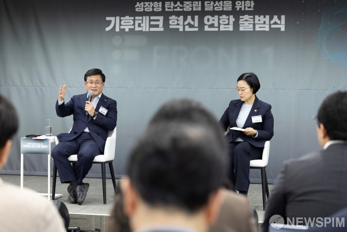 [서울=뉴스핌] 김성환 기후에너지환경부 장관이 4일 서울 마포구 프론트원에서 열린 기후테크 혁신 연합 출범식 이후 참여 기업들과 간담회를 갖고 의견을 나누고 있다.[사진=기후에너지환경부] 2026.03.04 photo@newspim.com