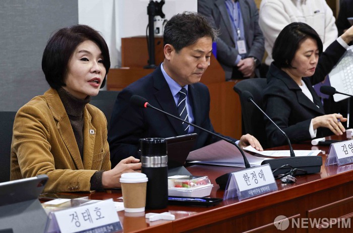 [서울=뉴스핌] 윤창빈 기자 = 한정애 더불어민주당 정책위의장이 5일 오전 서울 여의도 국회 의원회관에서 열린 중동 현안 관련 더불어민주당-재계 긴급 간담회에서 모두발언을 하고 있다. 2026.03.05 pangbin@newspim.com