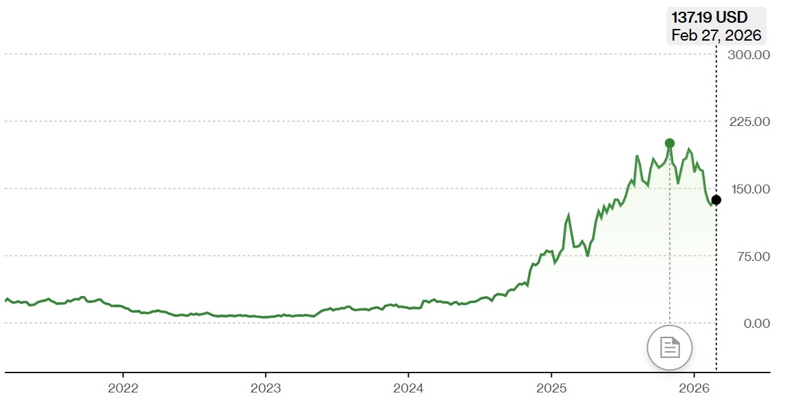 무려 100배에 이르는 선행 주가수익률(PER)과 지난 3년간 2300%에 달하는 폭등에 연초부터 내림세를 연출했던 주가가 급반전을 이룬 것도 이 때문이다. 전쟁 수혜주와 과열된 AI 국방주의 양면을 모두 보여준다는 평가다.
