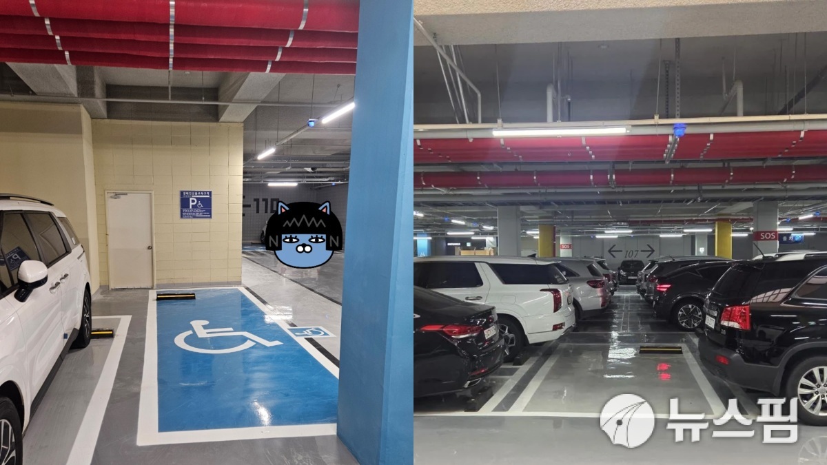 [서울=뉴스핌] 송현도 기자 = 차량을 앞뒤 좌우로 바짝 붙여 대야만 하는 기형적인 테트리스식 주차선과 기둥에 가로막혀 차량 진입 자체가 불가능한 장애인 전용 주차구역 [사진=독자 제공] 2026.03.05 dosong@newspim.com