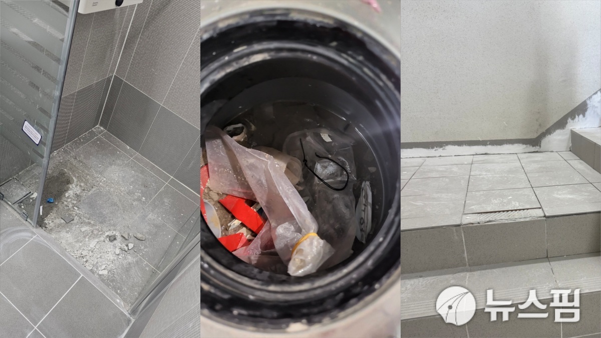 [서울=뉴스핌] 송현도 기자 =가구 내부, 공용 공간에서 발견된 마감 부실 사항. 소주병 등의 쓰레기가 버려져 있으며, 타일 등이 탈락돼 있다. [사진=독자 제공] 2026.03.05 dosong@newspim.com