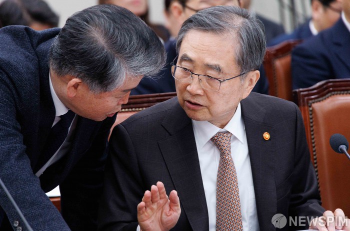 [서울=뉴스핌] 윤창빈 기자 = 조현 외교부 장관이 6일 오전 서울 여의도 국회에서 외교통일위원회에서 열린 중동 사태관련 긴급 현안질의에서 김경협 재외동포청장과 대화하고 있다. 2026.03.06 pangbin@newspim.com