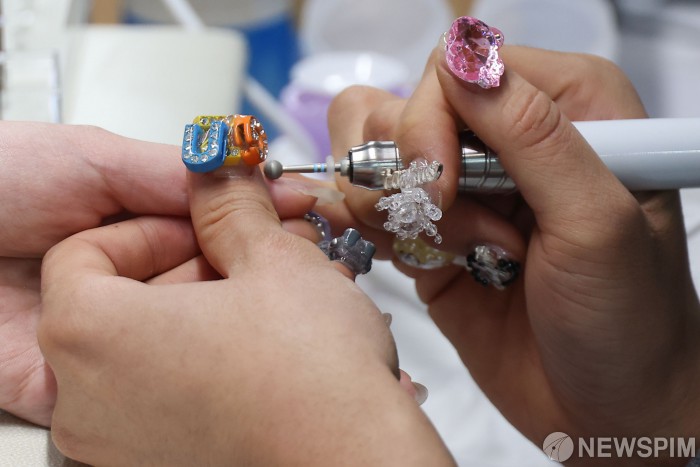 [서울=뉴스핌] 류기찬 기자 = 6일 오전 서울 강남구 세텍에서 열린 ‘네일엑스포 코리아’를 찾은 관람객들이 네일 제품들을 체험하고 있다. 2026.03.06 ryuchan0925@newspim.com