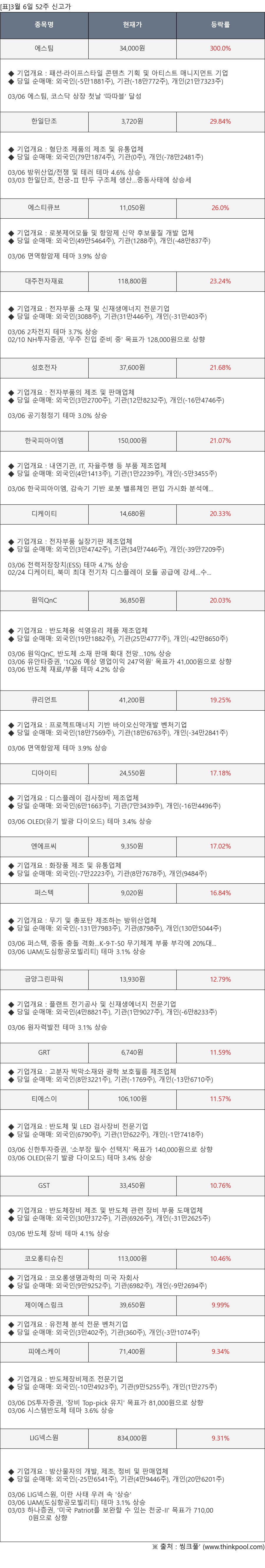 [서울=뉴스핌] 로보뉴스 = 3월 6일, 인공지능 투자비서 ‘AI라씨로’가 52주 신고가가 발생한 에스팀(458350), 한일단조(024740) 등에 대해 최근 동향을 분석했다.