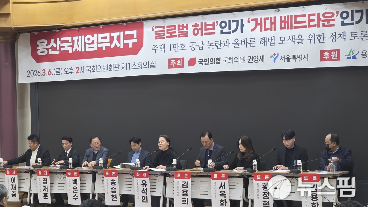 6일 오후 서울 여의도 국회의원회관 제1소회의실에서는 권영세 국민의힘 의원 주최로 '용산국제업무지구 글로벌 허브인가 거대 베드타운인가' 정책 토론회가 열렸다. 이날 토론회에는 여권 주요 인사들과 도시계획 전문가, 지역 주민들이 대거 참석해 국토교통부의 일방적인 1만가구 확대안을 강도 높게 비판했다.