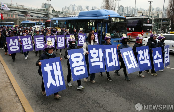 [서울=뉴스핌] 이건주 인턴기자 = 민주노총 조합원들이 6일 오후 서울역에서 '3.8 세계 여성의 날 전국노동자대회'가 열리는 광화문 동십자각 방향으로 행진하고 있다. 2026.03.06 kunjoo@newspim.com