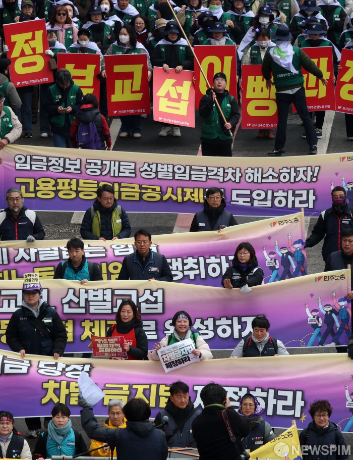 [서울=뉴스핌] 이건주 인턴기자 = 민주노총 조합원들이 6일 오후 서울역에서 '3.8 세계 여성의 날 전국노동자대회'가 열리는 광화문 동십자각 방향으로 행진하고 있다. 2026.03.06 kunjoo@newspim.com