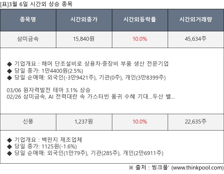 [표]3월 6일 시간외 상승 종목 및 최근 동향