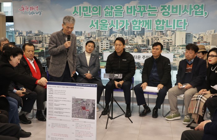 [서울=뉴스핌] 양윤모 기자 = 오세훈 서울시장이 지난해 11월 서울 중랑구 중화동 중화마중마을활력소에서 329-38번지 일대 중화동 모아타운 현장 주민간담회를 열고 있다.