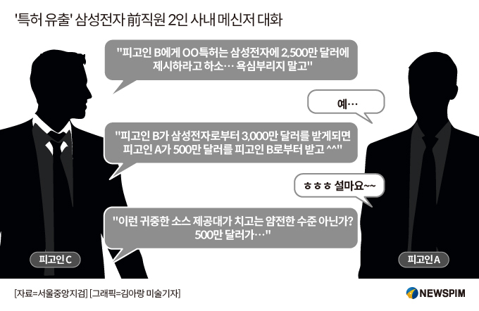 [서울=뉴스핌] 홍석희 기자 = 검찰이 특허 관련 기밀정보를 유출하는 대가로 100만 달러를 수수한 혐의를 받는 삼성전자 전 직원을 구속 상태로 재판에 넘겼다. 유출에 가담한 동료 직원이 사내 메신저로 "500만 달러는 요구하라"고 부추기는 등 대담하게 범행을 공모했지만, 검찰의 신속한 수사에 덜미를 잡혔다.
