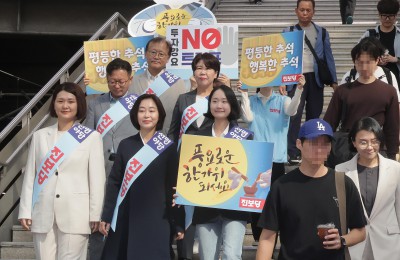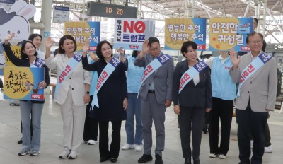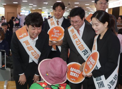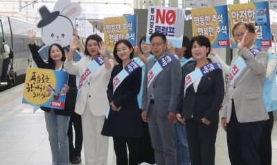 서울역 추석 귀성 인사하는 김재연 진보당 상임대표와 손솔 의원