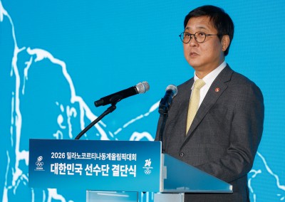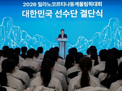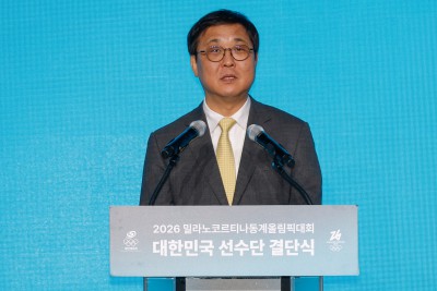 밀라노 동계올림픽 결단식 격려사 하는 최휘영 문화체육관광부 장관