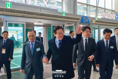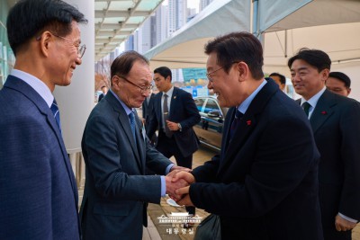 인사 나누는 이재명 대통령 - 이해찬 민주평화통일자문회의 수석부회장
