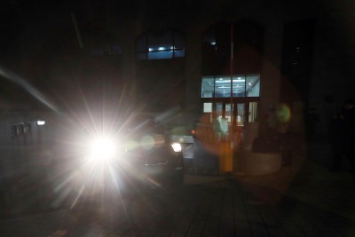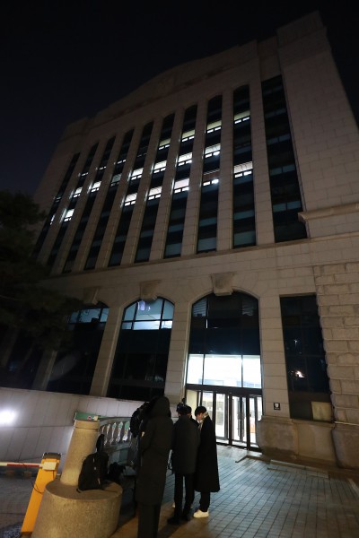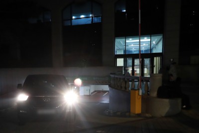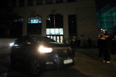 통일교 서울본부 나서는 경찰 차량... 압수수색은 계속