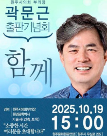곽문근 원주시의회 부의장, 북콘서트 '함께' 19일 개최 [원주=뉴스핌] 이형섭 기자 = 곽문근 강원 원주시의회 부의장이 19일 원주문화원 공연장에서 '함께'라는 제목의 에세이집 출판을 축하하는 북콘서트를 개최한다고 10일 밝혔다. 곽문근 원주시의회 부의장, 북콘서트 '함께' 19일 개최.[사진=곽문근 부의장] 2025.10.10 onemoregive@newspim.com 곽 부의장은 이 에세이에는 '시민의 바람이 곧 정책이다'라는 신념이 포함되어 있으며, 정치적 신념뿐만 아니라 곽 부의장의 가족사와 어려운 시절을 극복한 이야기도 담겼다고 밝혔다. 곽문근 부의장은 "시의원으로서 7년 동안 시민들과 소통하기 위해 매일 글을 작성해왔으며, 일부 내용이 이번 에세이에 소개됐다"고 말했다. onemoregive@newspim.com 25-10-10 17:26